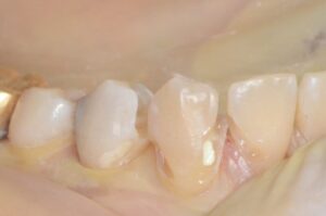 下の写真のようにピンを打って支えを作った歯にアマルガムを充填し、そのアマルガムを残したまま、ゴールド修復を行い、歯を被せることによって、強度を取り戻した歯にすることができます。