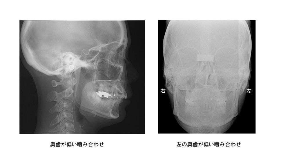 片方の奥歯だけ低くなると、顎が左右的に曲がります。こうなると単純ではない様々な体調不良が出てきます。(詳しくはこちら
